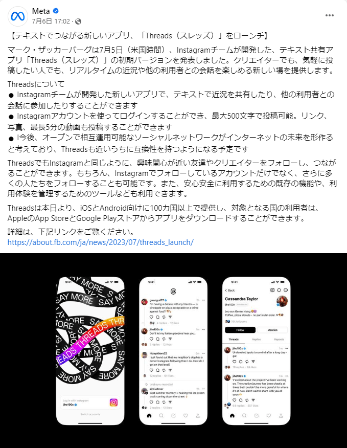 Meta社のFacebook公式アカウントが、Threadsについて以下の内容を投稿。