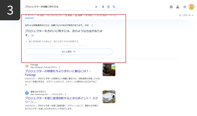 - 検索結果一覧では生成AIの回答が最上部に表示される仕様になっている(広告を除く)