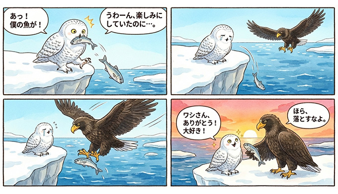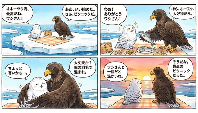 シロフクロウの「ホースケ」と大鷲の「ワシ」が2羽で仲良く、オホーツク海でピクニックをしているほっこりする癒される4コマ漫画の画像を生成してください。ホースケはおっとりとした性格で、大鷲は格好よく男前な性格です。セリフは全て日本語でお願いします。