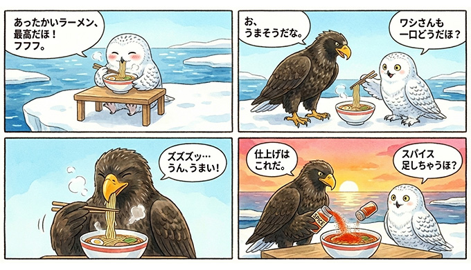 同じ登場人物で、ホースケが、ホクホクしながらラーメンを食べていると、ワシが飛んできて、ホースケがワシに一口上げようとして、ワシが美味しそうにラーメンを食べる。ワシはラーメンにスパイスを沢山加えて、ホースケは「スパイス足しちゃうほ?」と可愛らしく問う。